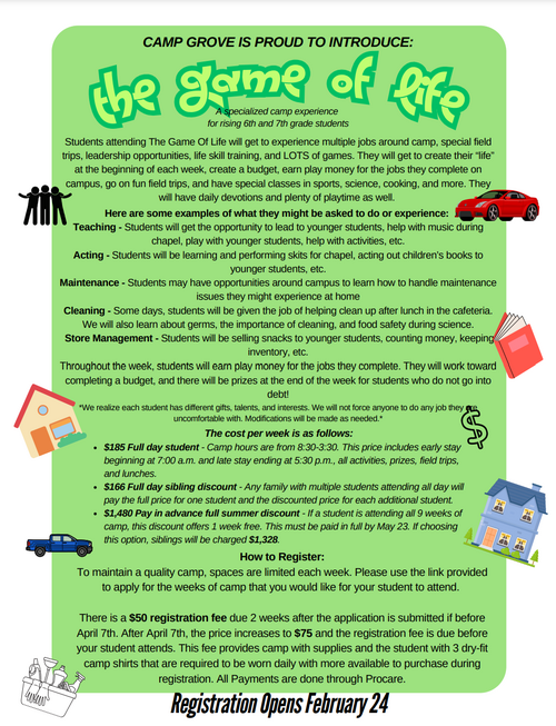 We are happy to introduce a new program for our Union Grove Christian School rising 6th and 7th graders! They will be challenged to create a budget each week, work to earn credits toward the game, and earn prizes at the end of the week.