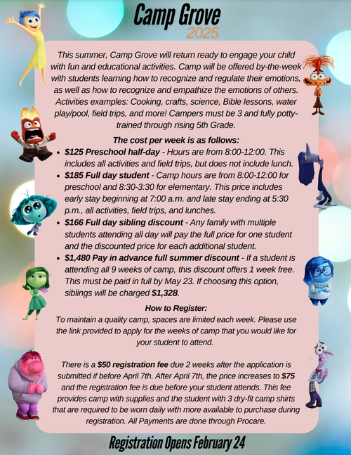 Welcome to Camp Grove, where every summer day is an adventure waiting to happen! Our camp provides a vibrant and engaging atmosphere where children can immerse themselves in a world of excitement and discovery. With a diverse array of activities including games, field trips, inspiring chapel services, and so much more, Camp Grove offers an enriching experience tailored to ignite the imagination and create lasting memories. Get ready to embark on a journey filled with laughter, learning, and endless fun!